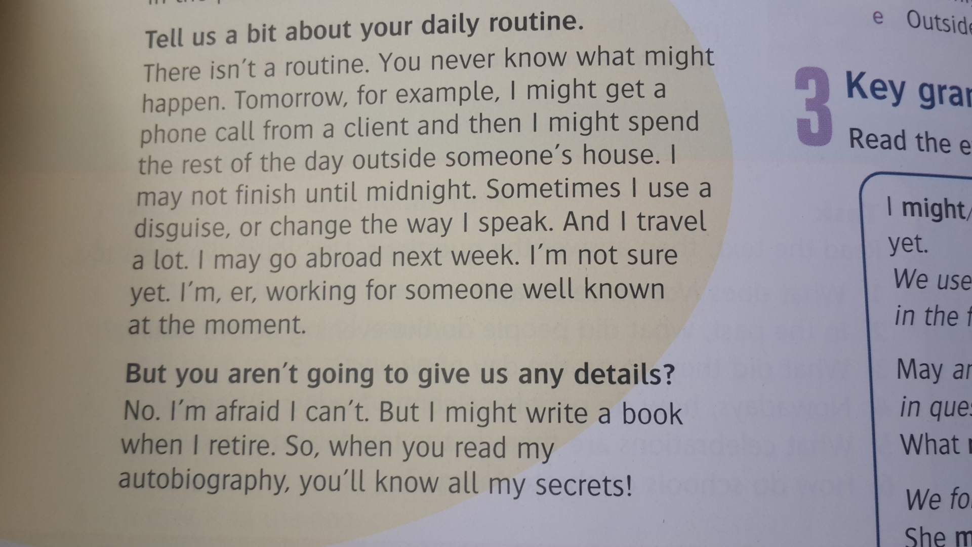 Расскажите нам немного о вашей повседневной жизни. Существует не рутина. Вы никогда не знаете, что может произойти. Завтра, например, я мог бы получить телефонный звонок от клиента, а затем л может провести остаток дня за пределами чей-то дом. Я никогда не может закончиться до полуночи. Иногда я использую маскировку, или изменить способ я говорю. И я много езжу. может уехать за границу на следующей неделе. Я еще не уверен. Я, э-э, работать для кого-то хорошо известной на данный момент. Но вы не собираетесь дать нам какие-либо подробности? Нет, я боюсь, что я не могу. Но я мог бы написать книгу, когда я выйду на пенсию. Так что, когда вы читали мою автобиографию вы будете знать все мои секреты!