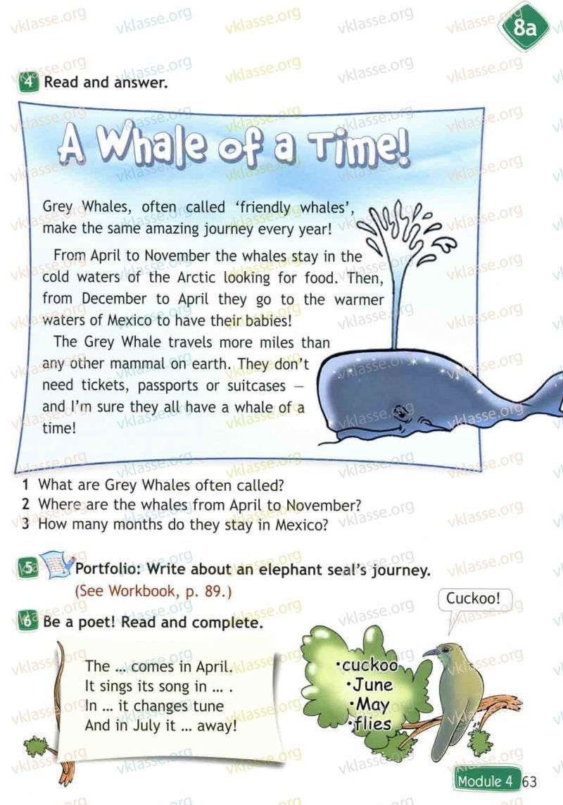 Серые киты, часто называемые "дружелюбными китами" каждый год совершают удивительное приключение! С апреля по ноябрь киты остаются в холодных водах Арктики в поисках пищи. Затем, с декабря и до апреля, они направляются в более теплые воды Мексики, чтобы завести детей! Серый Кит проходит миль больше, чем любое другое млекопитающее на Земле. Им не нужны билеты, паспорта или чемоданы и я уверен, они замечательно проводят время! (A whale of a time - идиома)