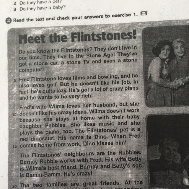 1. Встретиться Флинстоуны! Вы знаете Флинстоуны? Они не живут в наше время. Они живут в каменном веке! У них есть каменные машины, и камень компьютеры!... и он тоже любит гольф, но он не любит свою работу. В самом деле, он довольно ленивый. У него много безумных планов ... и он хочет быть очень богатым! Жена Фреда Вилма любит своего мужа, но она не любит его безумные идеи. Вильма не работает, потому что она сидит дома с их маленькой дочкой галькой, она любит музыку и сама играет на пианино, домашних животных, Флинстоунов красный динозавр! Его зовут Дино, когда Фред приходит домой с работы, Дино целует его! Флинстоуны! соседи завалов Фред. Его жена (лучший друг Вилма, Барни и сын Бетти, Бам-БАМ. Он сумасшедший! ... две семьи большие друзья. ...