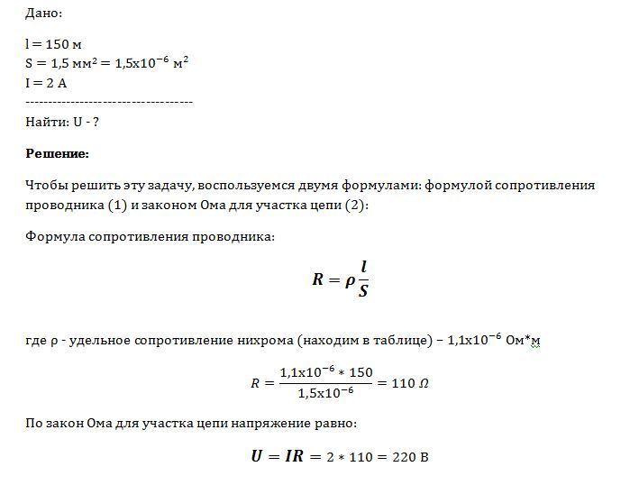 Определите напряжение на концах нихромового проводника длиной 150м и сечением 1,5мм в квадрате ,по которому идет ток 2А