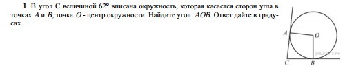 В четырехугольнике ACBO ∠A и ∠ B по 90 Сумма углов четырехугольника 360 градусов ∠АОВ = 360 - 90 - 90 - 62 = 118