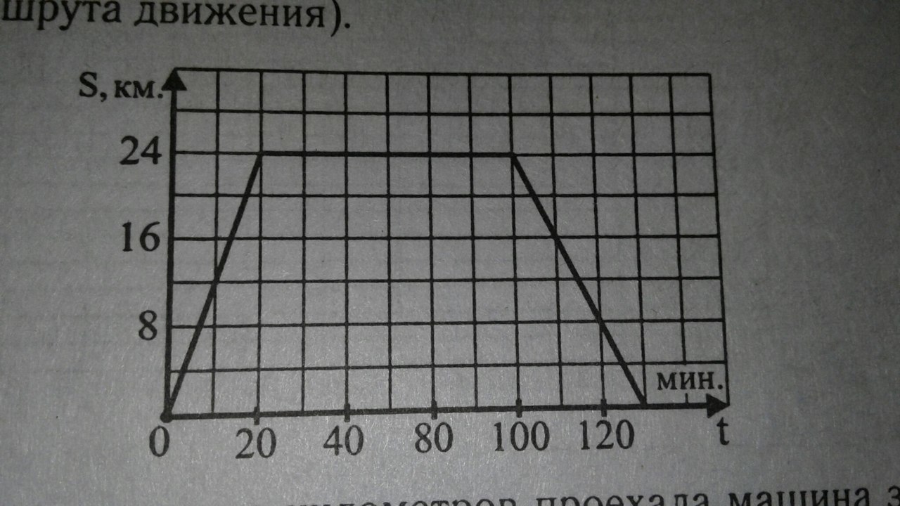 Грузовая машина отправилась из магазина на склад,где провела некоторое время в процессе погрузки,и вернулась обратно по тому же самому маршруту. На рисунке изображен график движения этой машины: по оси абсцисс откладывается время (в минутах) с момента выезда машины от магазин,по оси ординат-расстояние от машины до магазина (в км,вдоль маршрута движения)