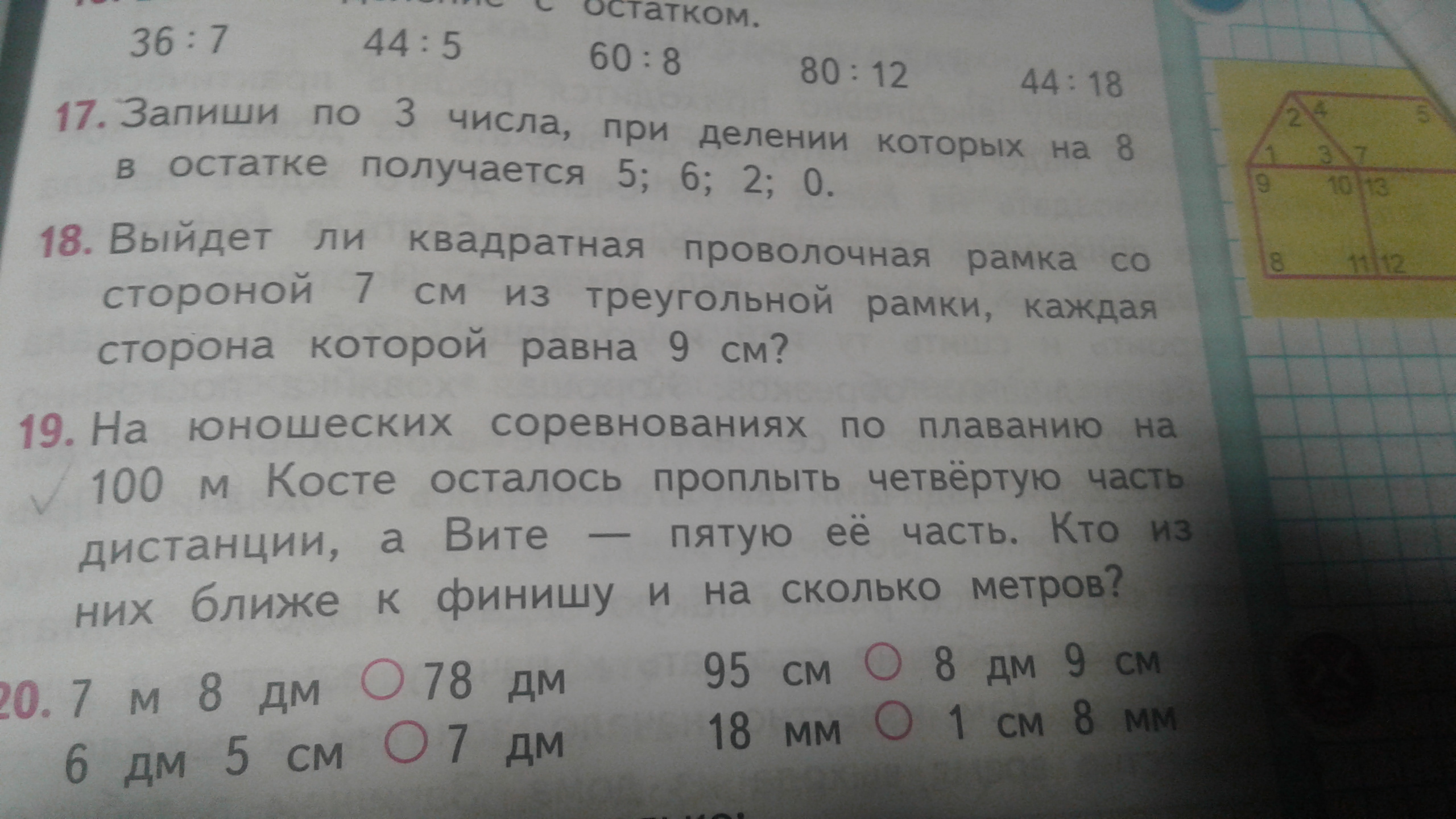 1)100/4=25(м)-осталось Косте. 2)100/5=20(м)-осталось Вите. 3)25-20=5(м) Ответ:ближе к финишу Витя и на 5 м.