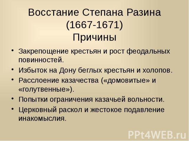 Законотворческие акты Земского собора, максимально закрепощающие крестьян.Возложение больших налогов и повинностей на крестьян.Введение бессрочного срока сыска сбежавших крепостных крестьян.Военные действия на Украинских землях.Усиление царской власти и ограничение свободы казачества.Географическое скопление беглых крестьян и казаков в районе Дона.Нехватка продовольствия, угроза голода.