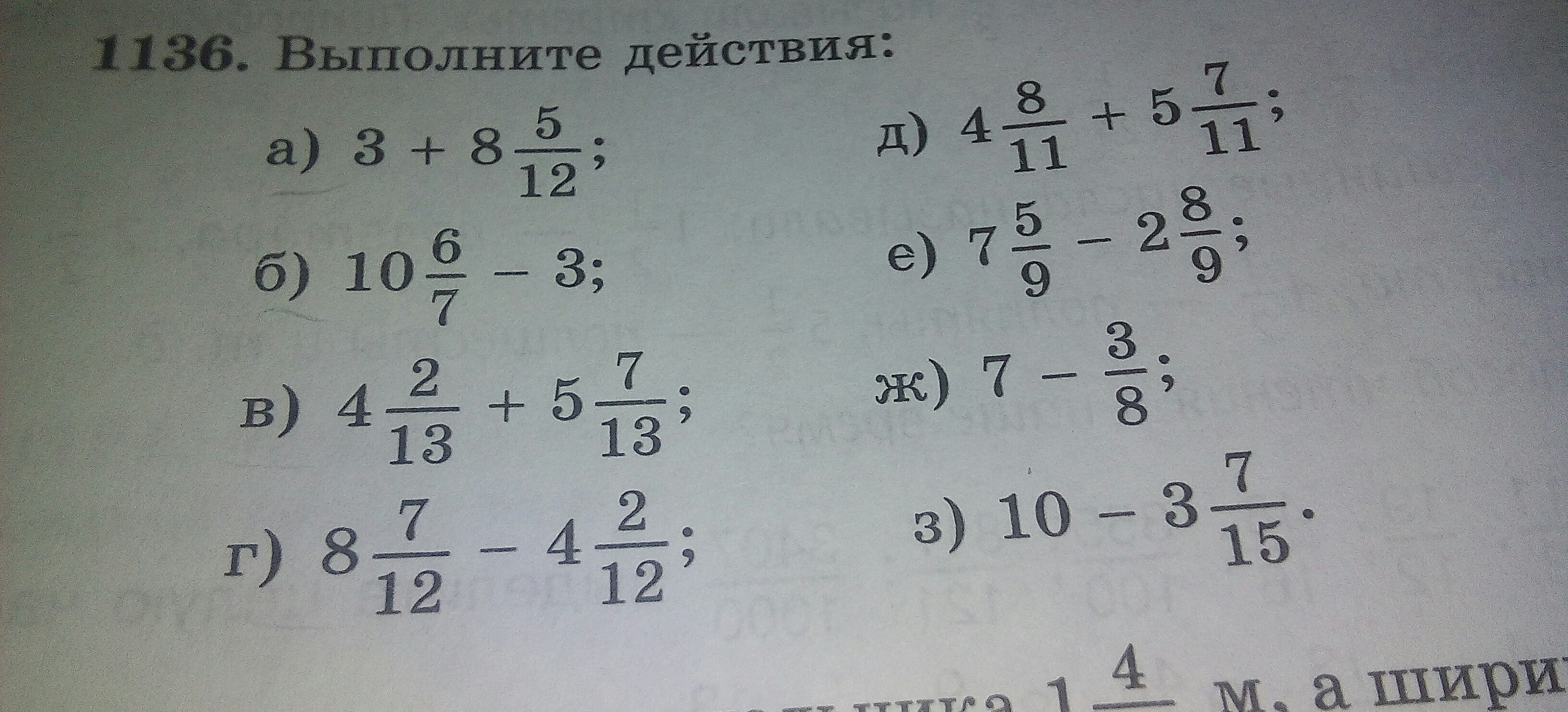 а) 11 5/12; б) 7 6/7; в) 9 9/13; г) 4 5/12; д) 10 4/11; е) 4 1/3; ж) 6 5/8; з) 6 8/15; чувак тут расписывать нечего. задания устные