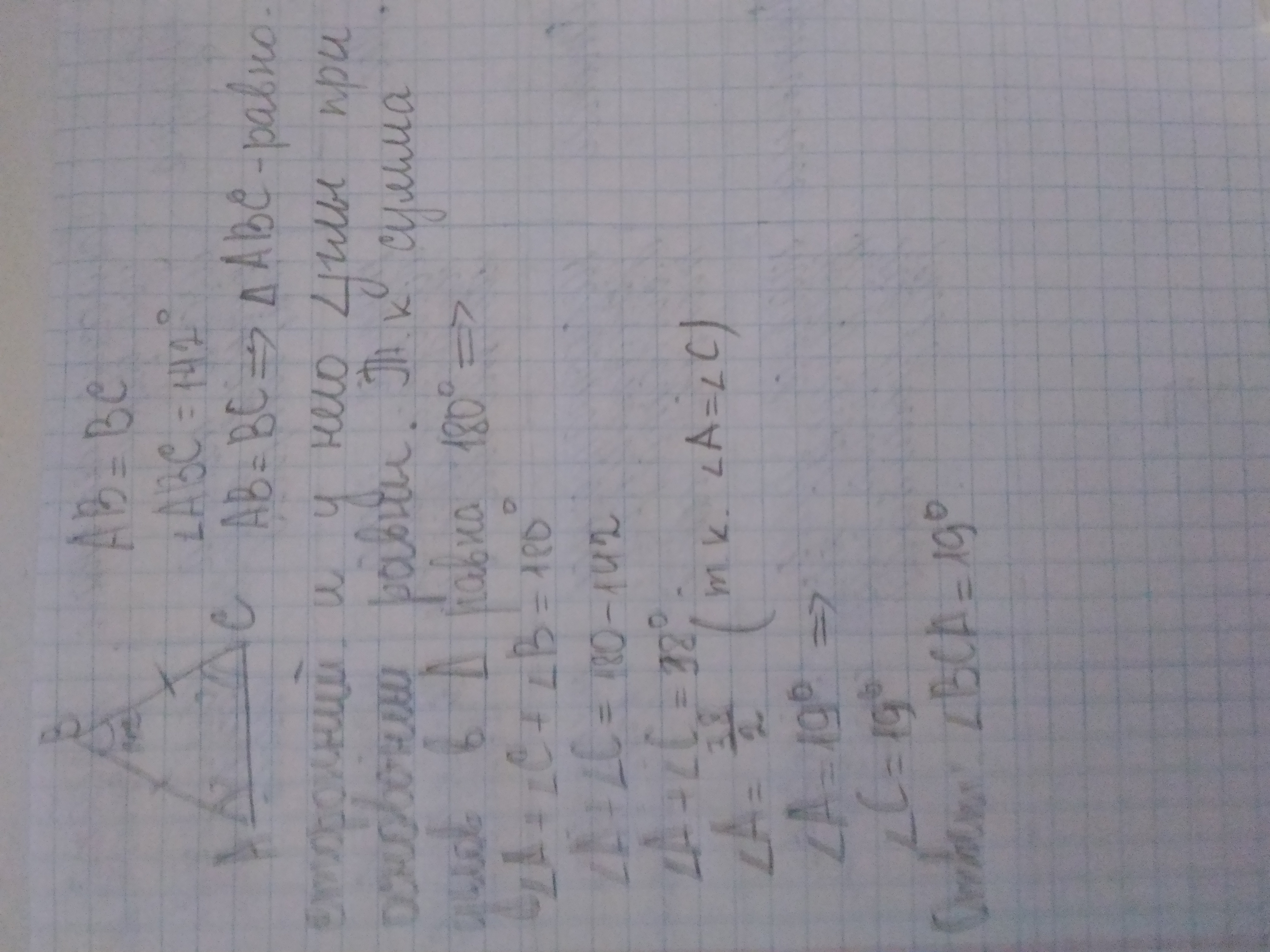 В треугольнике ABC известно, что , AB=BC..∠ ABC=142° Найдите ∠ BCA . Ответ дайте в градусах.