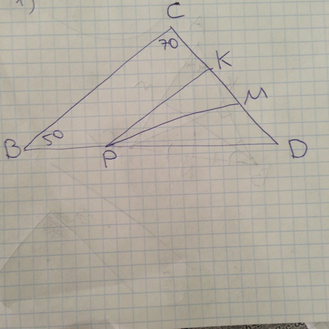Угол В=углу КРМ=50 (это соответственные углы). Тогда угол МРК=углу МРD=угол КРМ/2=50/2=25 (РМ-биссектриса). Угол D=180-угол В-угол С=180-50-70=60. Угол РМD=180-угол D-угол МРD=180-60-25=95