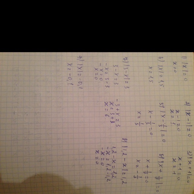 решите у.е 1)|х|=0 2)|х-1|=0 3)|х+1|=0 4)|х|=1,5 5)|х-1/3|=0 6)|х+1/7|=0 7)|3-х|=3 8)|1,2-х|=1,2 9)|х|=-0,1 плиз