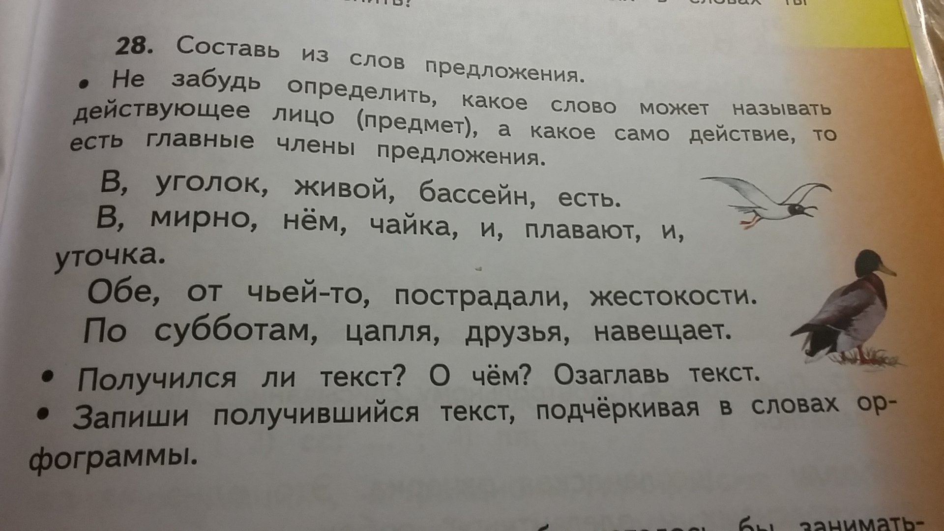 в живом уголке есть бассейн .мирно в нём плавают и чайка и уточка.обе пострадали от чьей-то жестокости.по субботам друзья навещают цаплю.