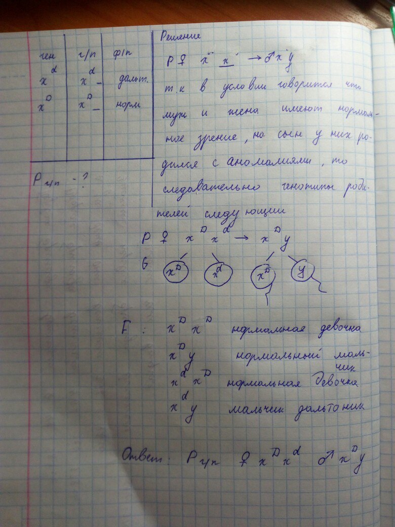 Ген дальтонизма (цветовой слепоты) рецессивный признак сцепленный с Х хромосомой. Муж и жена имеют нормальное зрение, а их сын дальтоник. Каковы генотипы родителей?