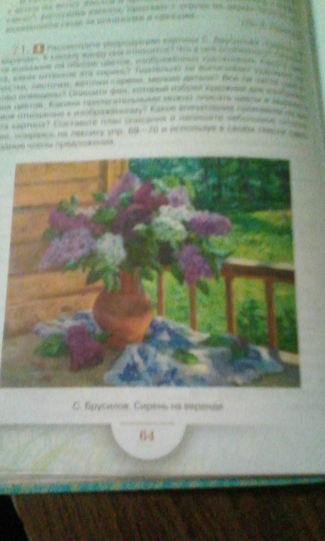 Свежий воздух так и манит лечь в сочную молодую траву и растворится в ней. Ласковое солнышко пронизывает своими лучами огромный благоухающий сад. Ветви так и шелестят негромкими разговорами между собой, тем самым создают легкую, тихую мелодию едва проснувшегося сада. В центре полотна стоит невероятно шикарный букет, а большие нарядные, свежие грозди тянут вниз, только срезаны ветви. Все тона сиреневого, белые, бордовые, бледно-голубые грозди играют на солнце. Кажется, что крошечные хрупкие цветочки разлетятся по всему саду от малейшего дыхания ветра.