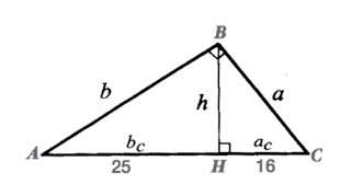 Найдите высоту h и стороны АВ и ВС прямоугольного треугольника АВС, если bс =25, aс=16.