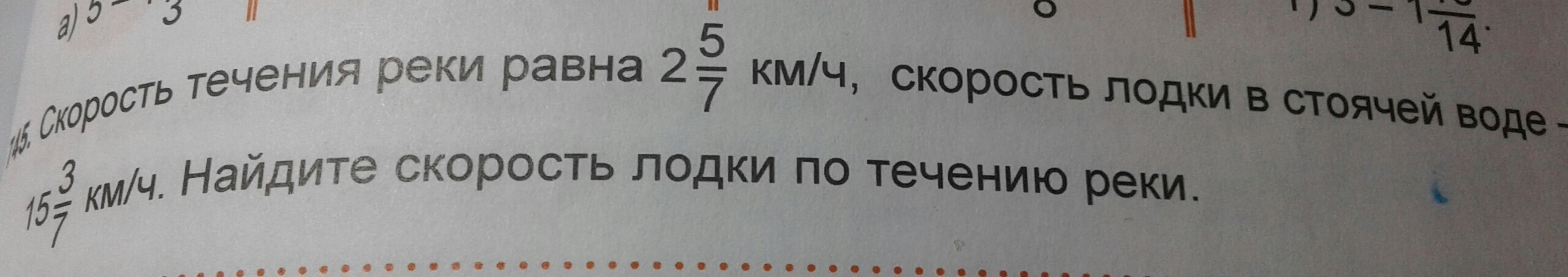 скорость течения реки 2,5/7 км/ч скорость лодки в стоячей воде 15,3/7 км/ч. Найдите скорость лодки по течению реки