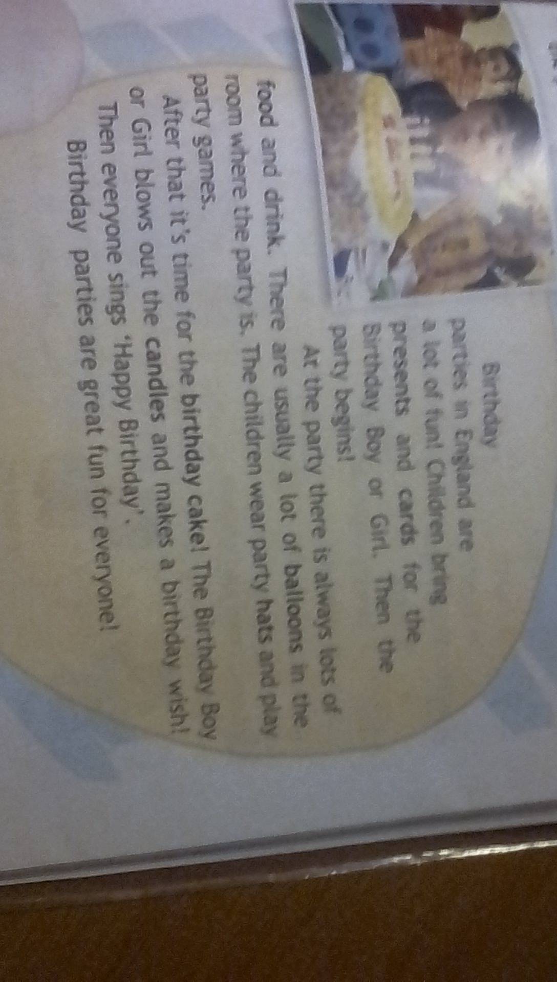 Дни рождения в Англии полны веселья. Дети приносят с собой подарки и карточко для именинника мальчика или девочки. Тогда ничинается праздник.