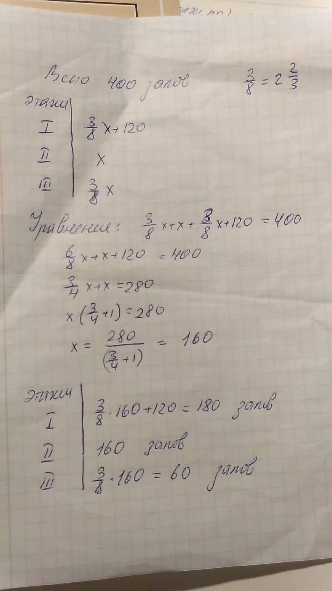 В Санкт-Петербурге в Зимнем дворце 400 залов.Залов на третьем этаже в 2 2/3 раза меньше чем на втором этаже и на 120 залов меньше чем на первом.Сколько залов на каждом этаже Зимнего дворца ? ПОМОИГТЕ ПЖ.