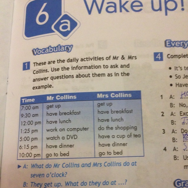 -Mr Collins watches a DVD. Mrs Collins has a cup of tea. What do Mr and Mrs Collins do at quarter past six?
