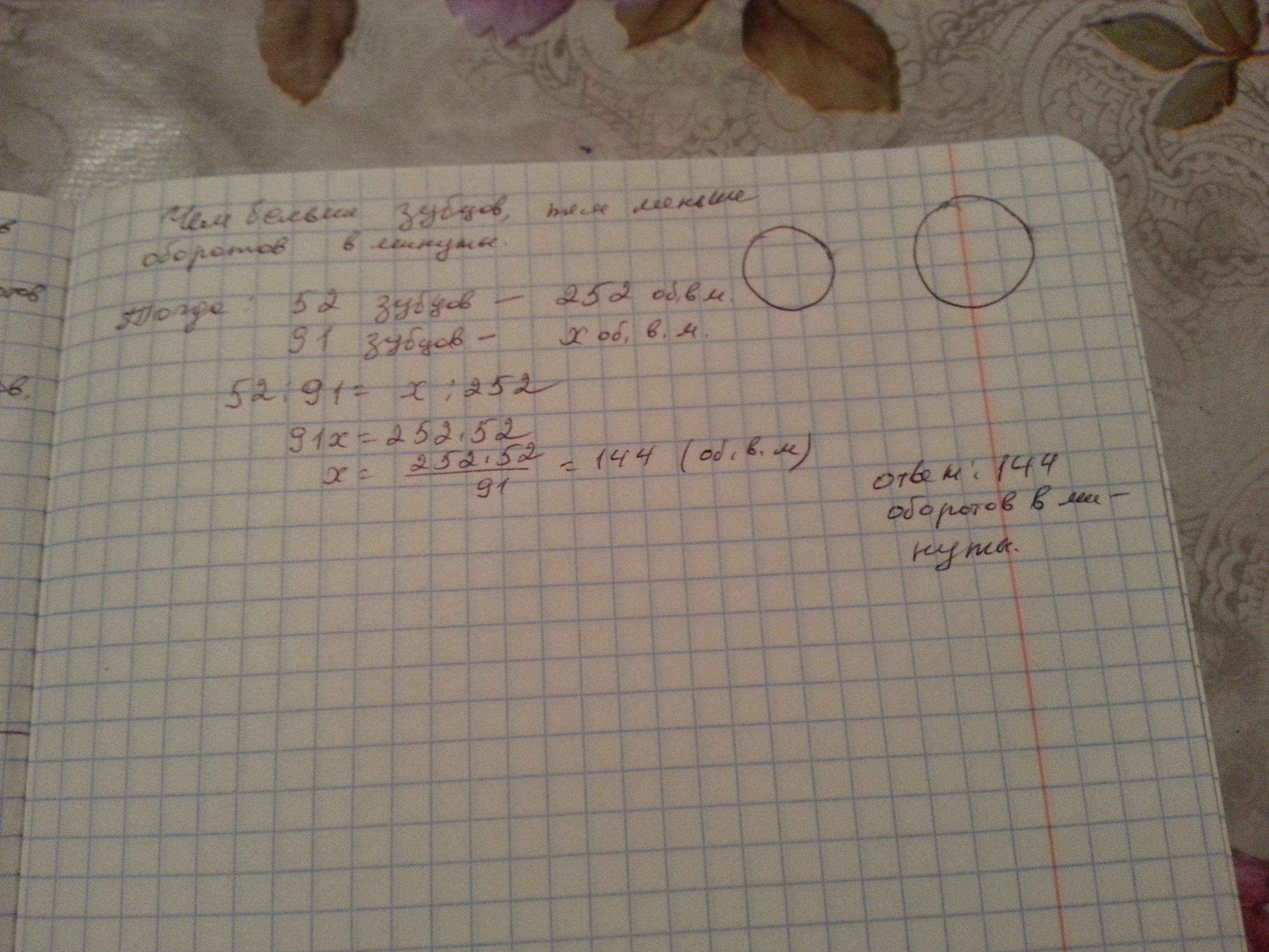 Третье колесо с с 52 зубцами совершает 252 оборотов в минуту. У второго колеса 13 Зубцов, у первого 91 зубец. сколько оборотов в минуту совершает первое колесо?
