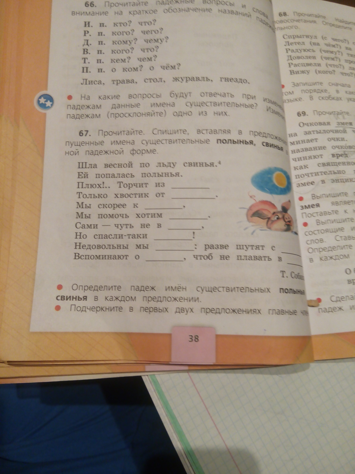 Шла (глагол, сказуемое) весной (существительное, дополнение) по льду (существительное, дополнение) свинья (существительное, подлежащее)