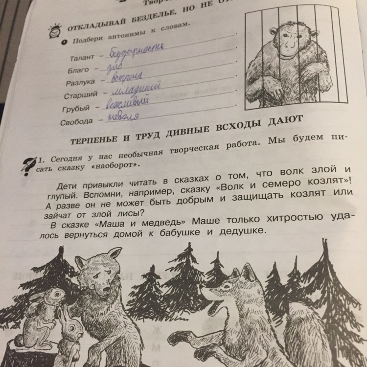 Насколько я поняла, надо просто переделать отрицательных героев сказок в положительных. Был волк плохим героем - его переделали в хорошую сторону, а хорошего героя - в плохую. Тут честно, даже я не очень задание поняла, но вроде так.