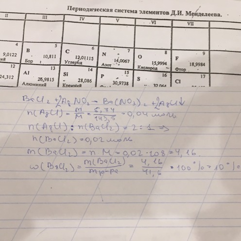 При взаимодействии раствора хлорида бария массой 41,6 г с нитратом серебра получено 5,74 г осадка. Определите массовую долю хлорида бария в исходном растворе. Схема реакции: BaCl2 + AgNO3 → AgCl↓ + Ba(NO3)2.