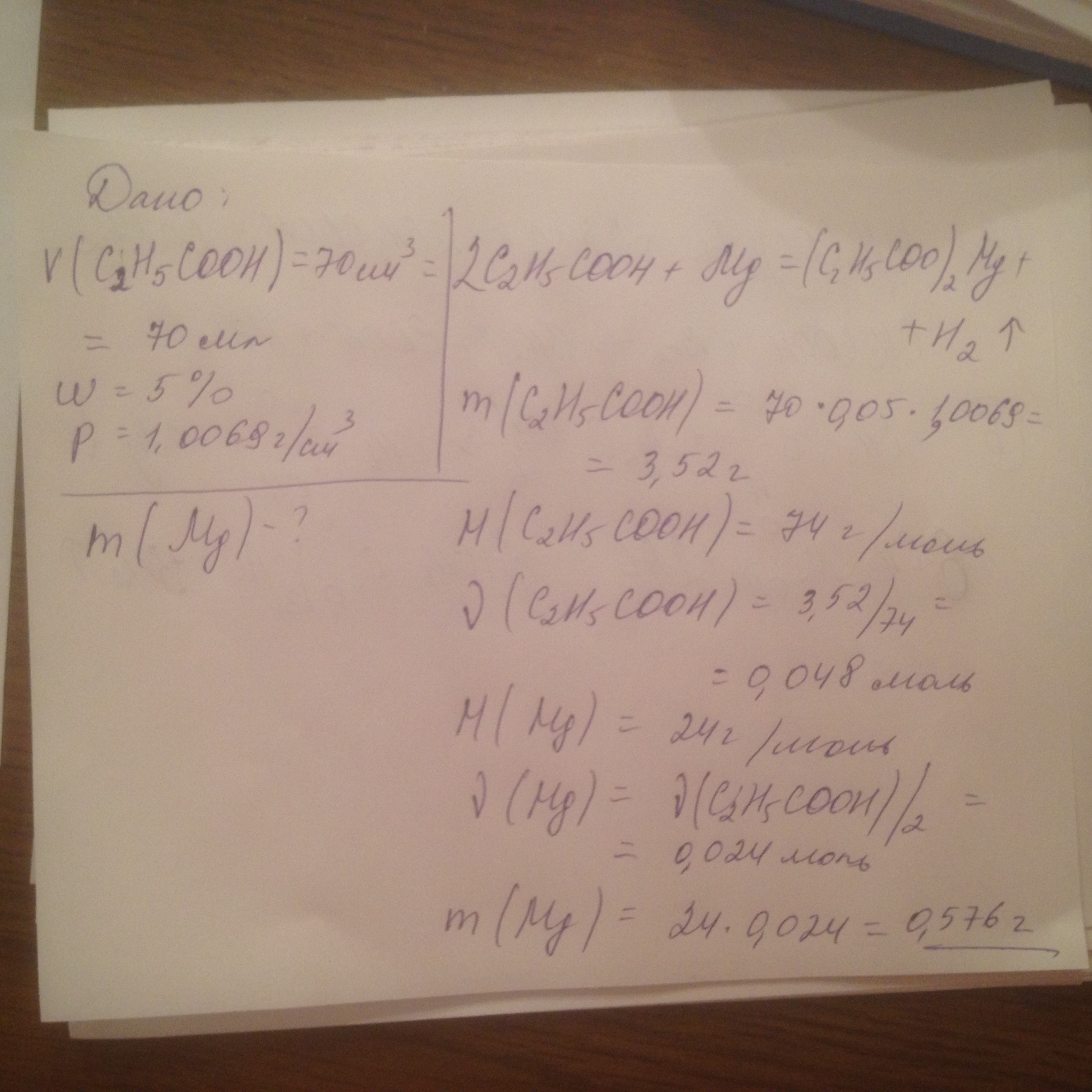 К раствору пропиновой кислоты объемом 70см3 с массовой долей кислоты 5% (p=1,0069г/см3) добавили магний массой а)0.60г; б) 0.57г