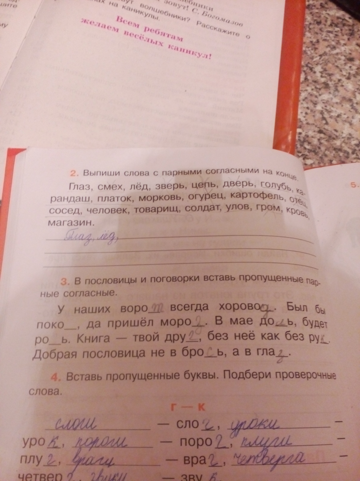 Глаз (з-с); лёд (д-т); цепь (п-б); голубь (б-п); карандаш (ш-ж); платок (к-г); морковь (в-ф); сосед (д-т); человек (к-г); солдат (т-д); улов (в-ф); кровь (в-ф).