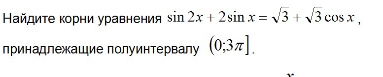 50+25 баллов! Помогите решить тригонометрическое уравнение, пожалуйста! Найдите корни уравнения sin2x+2sinx=√3+√3 cosx принадлежащие полуинтервалу (0;3пи]