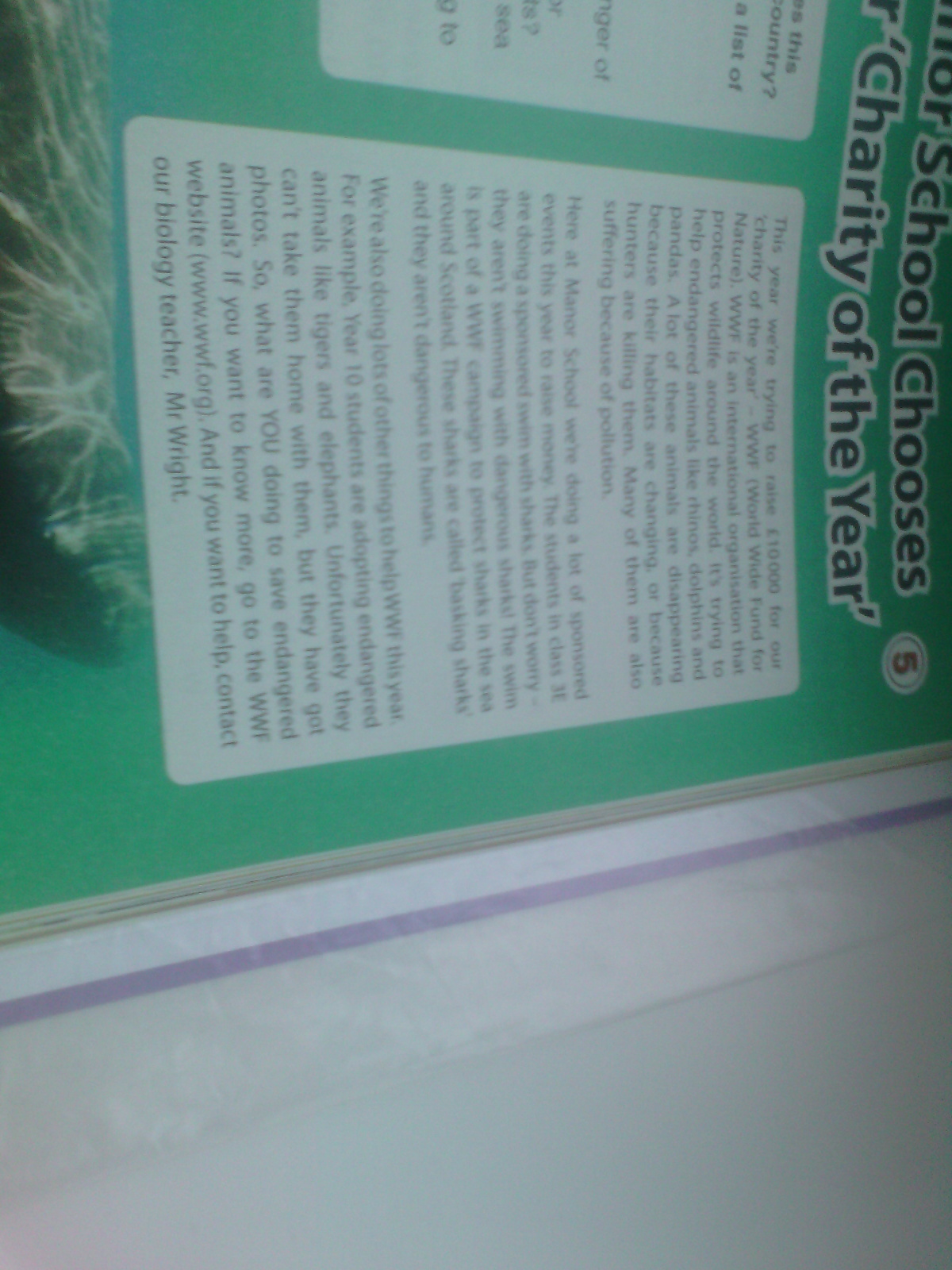 Мы занимаемся и другой деятельностью для WWF в этом году. Для примеры учащиеся 10 класа берут опеку над исчезающими видами такие как тигры и слоны. К сожалению они не могут взять их к себе домой, но у них есть их фото. Итак, а что Вы сделали чтобы спасти исчезающие виды животных? Если вы хотите знать больше - посетите вебсайт WWF (www.wwf.org). И если вы хотите помочь - свяжитесь с нашим учителем биологии - Мистером Райтом.