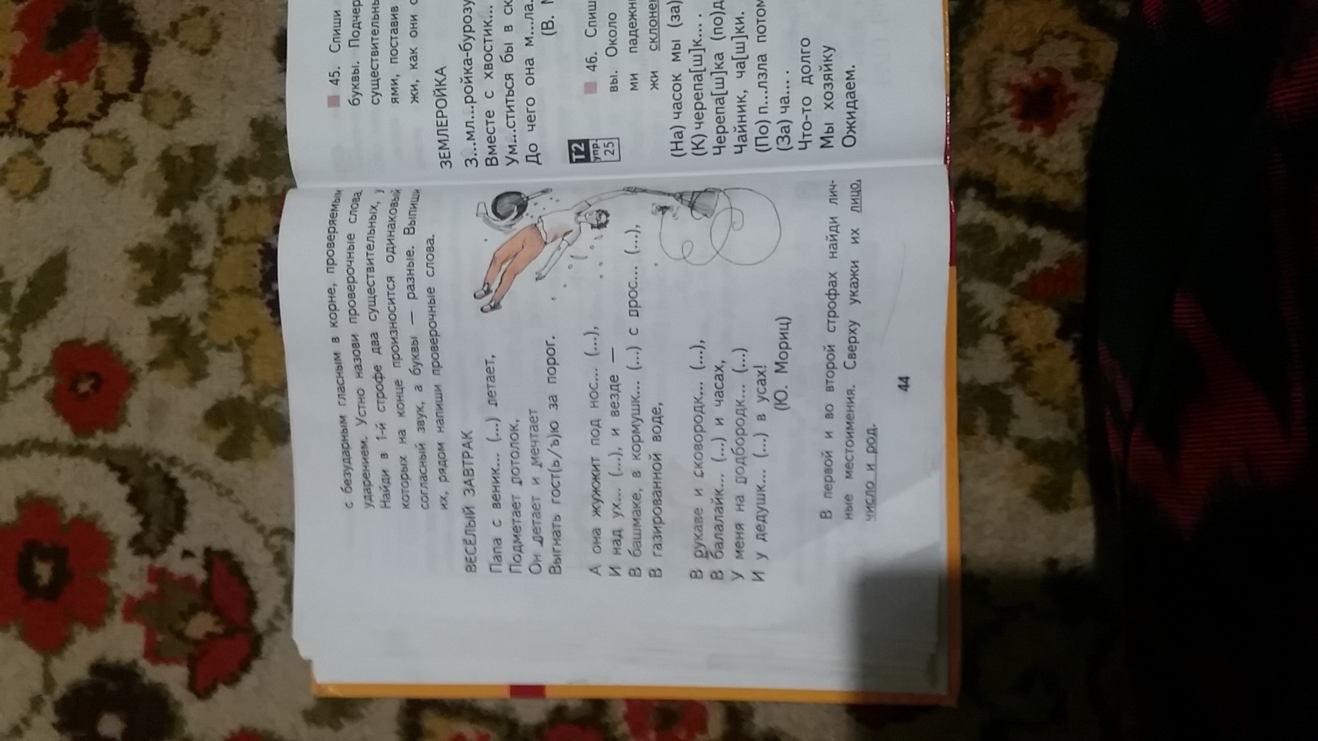 ВеникОМ, гостЬю, носОМ, ухОм, в кормушкЕ, с просОМ, сковородЕ, балалайкЕ, на подбородке.