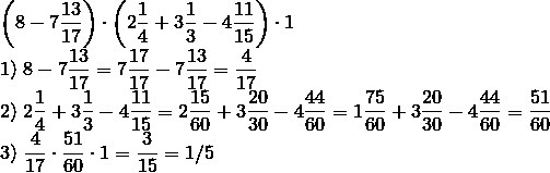 (8-7 13/17) * (2 1/4+3 1/3-4 11/15)*1
