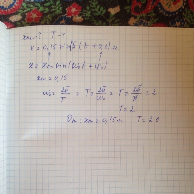 Какими будут амплитуда, период и начальная фаза, если гармонические колебания совершаются по закону х = 0,15 sin π (t + 0,3)м?