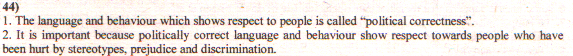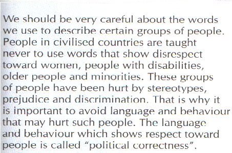 1.Мы должны быть очень осторжными со словами, которые мы используем, чтобы описать людей. Люди в цивилизованных городах обучены никогда не использровать слова, которые выражают неуважение к женщинам, к людям с ограниченными возможностями, к пожелым людям и к несовершеннолетним. Эти группы людей были ранены стереотипами, предрассудками и дискриминацией. Поэтому важно исключить язык и поведение, которое может ранить таких людей. Язык и поведение, которые показывают уважение к другим людям называются "полит. корректностью".