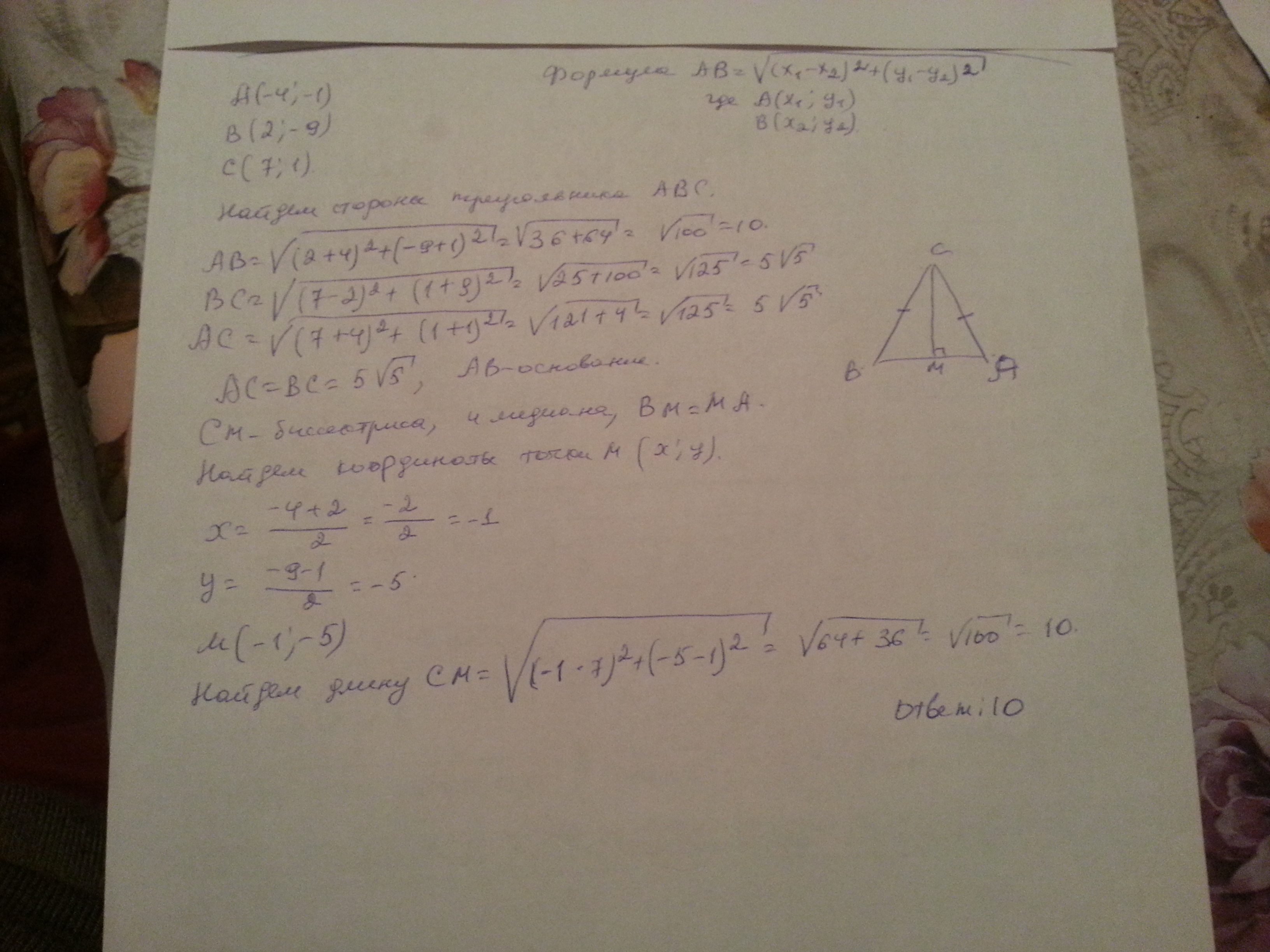 Докажите, что треугольник с вершинами А(-4;-1), B(2;-9), C(7;1) - равнобедренный и найдите длину его биссектрисы, проведенной к основанию