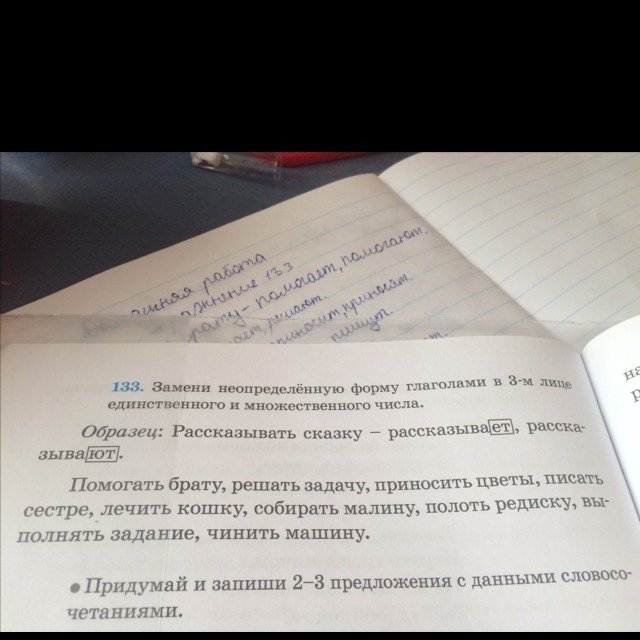 Помогать - помогает,помогают; Решать - решает,решают; приносить - приносит,приносят;писать- пишет,пишут;лечить-лечит, лечят;собирать-собирает,собирают;полоть- полет,полят;выполнять-выполняет,выполняют;чинить-чинит,чинят.