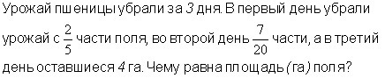 1)1-(2/5+7/20)=1-(8/20+7/20)=1-15/20=1-3/4=1/4(ч)-часть поля, убранная в третий день