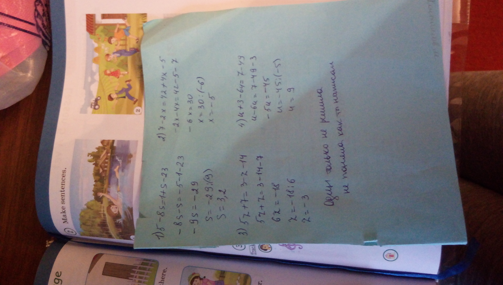 решить уравнение с проверкой 7кл,,,,,, 5-8s=1+s-23; 8+4 t=5-3t-25; 7-2x=42+4x-5; 5z+7=3-z-14; u+3-6u=7-49