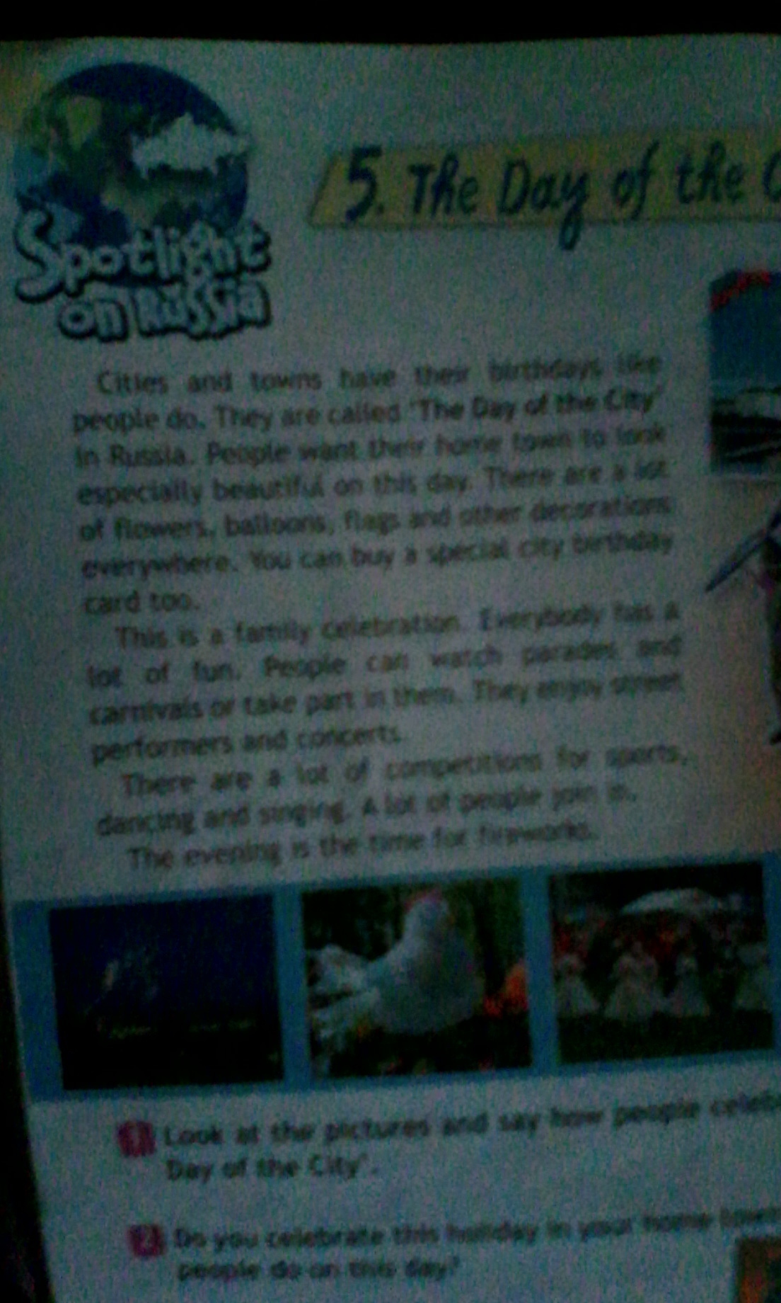У больших и маленьких городов тоже есть свой День Рождения, как и у людей. Они(эти дни) называются "Днем города" в России. Люди хотят, чтобы их родной город выглядел особенно красивым в этот день. Повсюду ( в этот день) много цветов, воздушных шариков, флагов и других украшений. Также, Вы можете купить специальную поздравительную открытку.