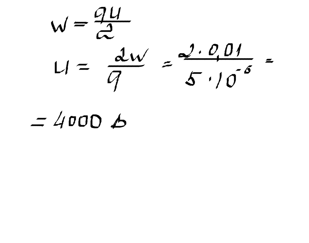 При сообщении конденсатору заряда, равного 5 ∙ 10-6 Кл, его энер-гия оказалась равной 0,01 Дж. Определите напряжение на обкладках кон-денсатора.