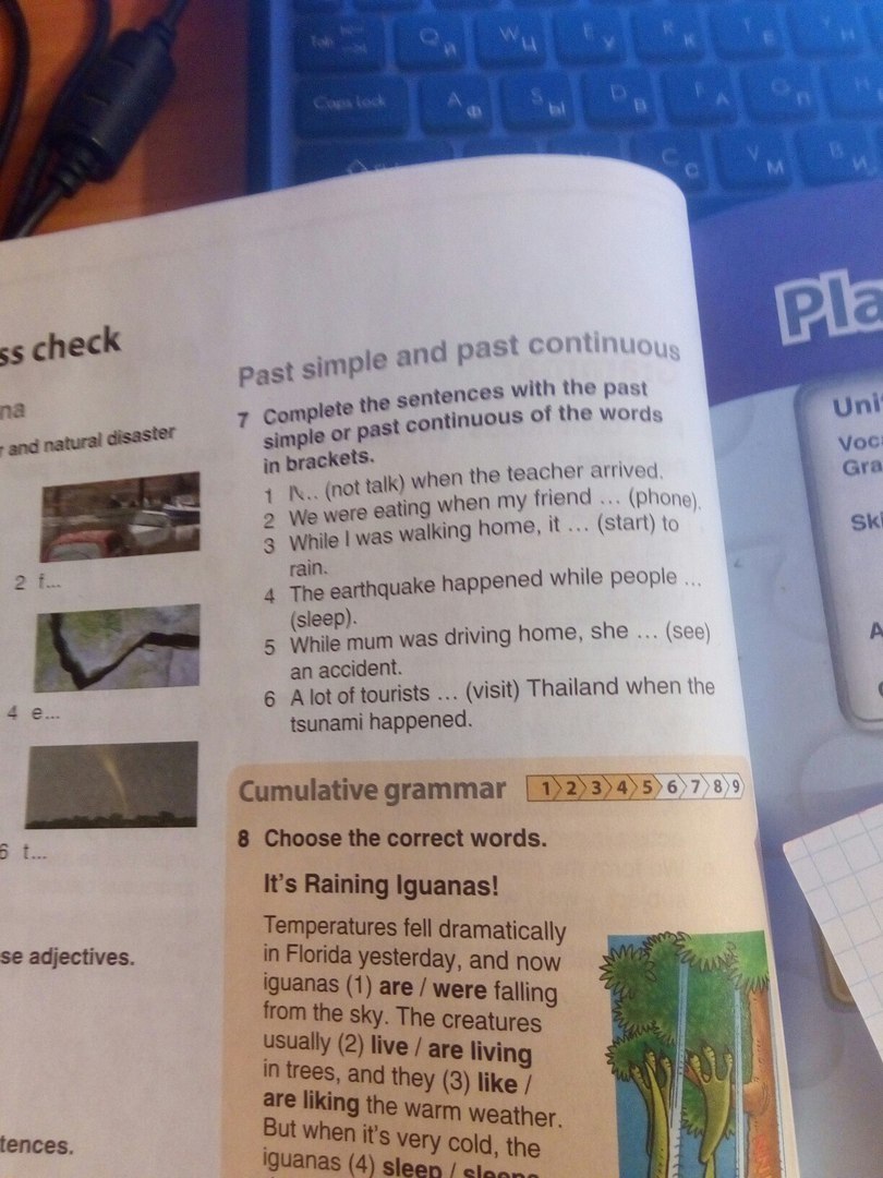 I am not talking when the teacher arrived.We were eating when my friend phoning.While I was talking home,it starting to rain.
