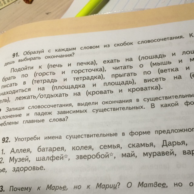 Подойти к печке, ехать на лошади,брать по горсточку, читать о мышке, писать в тетрадке, прыгать по ветке, находиться на площадке, весеть на ёлке, отдыхать на кровати.