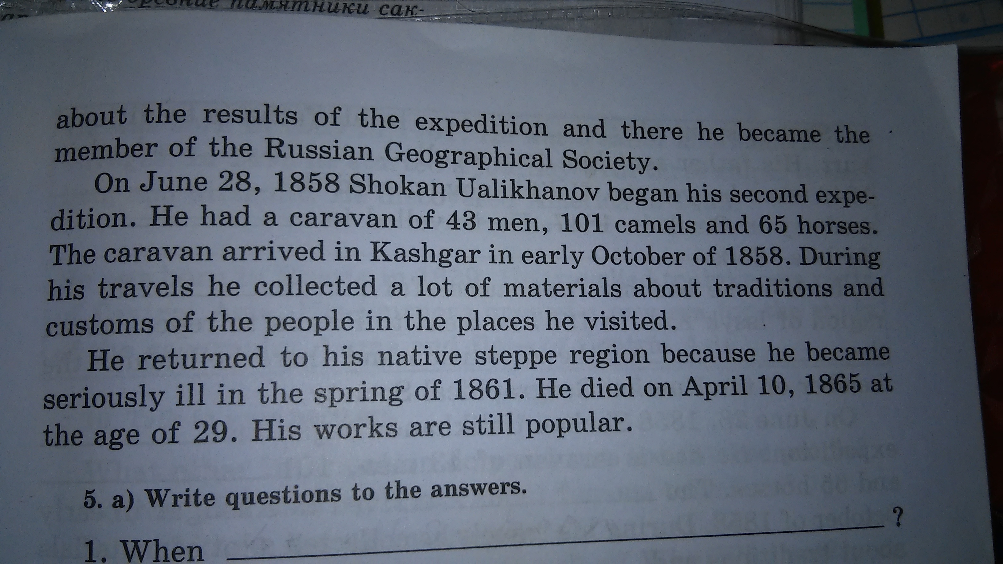 28 июня 1858 года Шокан Уалиханов начал свою вторую экспедицию. У него был караван из 43 мужчин, 101 верблюд и 65 лошадей. Караван прибыл в Кашгар в начале октября 1868 года. В течении своего путешествия он собрал много материала о традициях и обычаях людей в местах, которые они посетили.