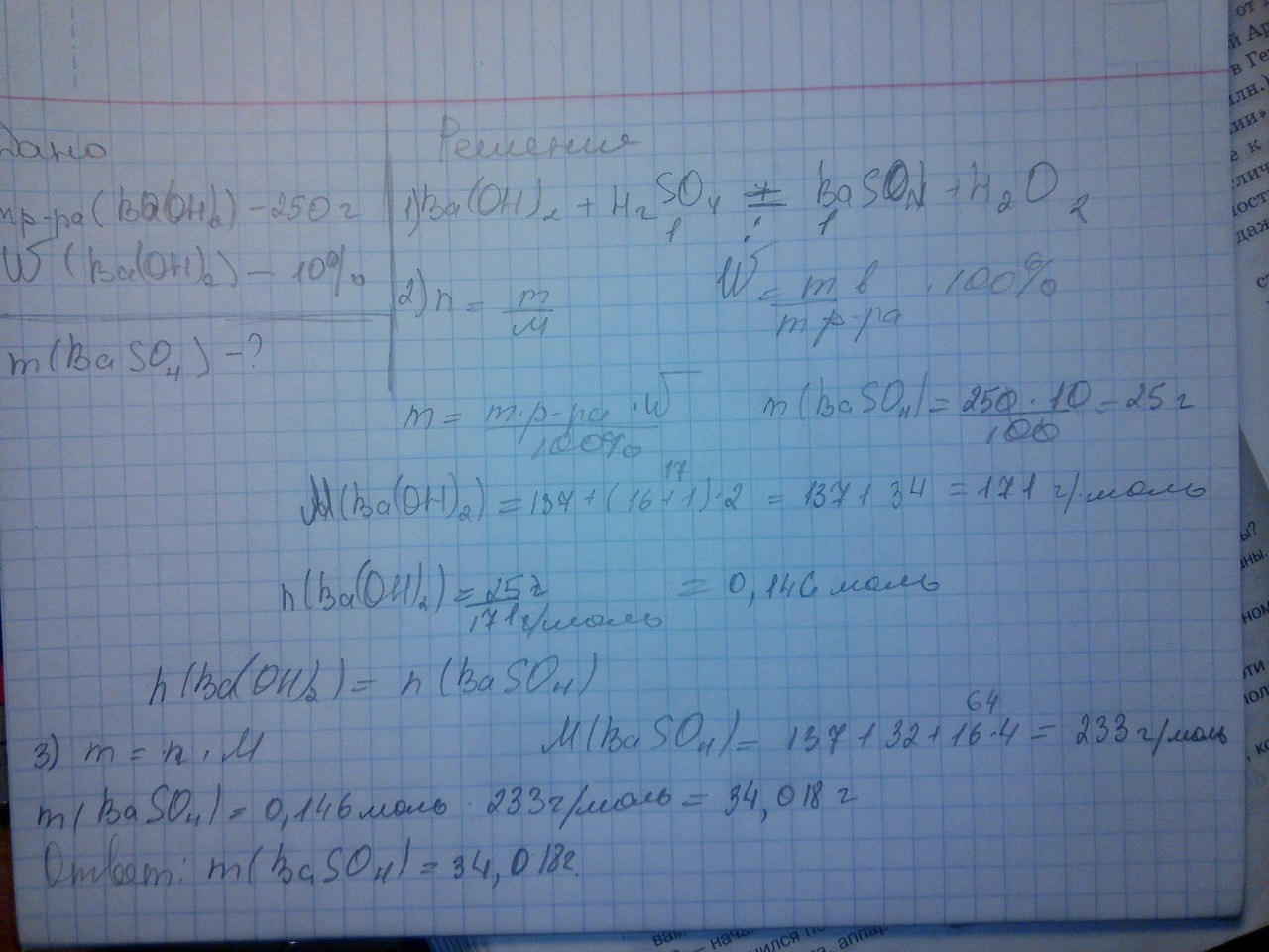 определите массу получившегося осадка, если серная кислота прореагировала с 10% раствором гидроксида бария массой 250 г