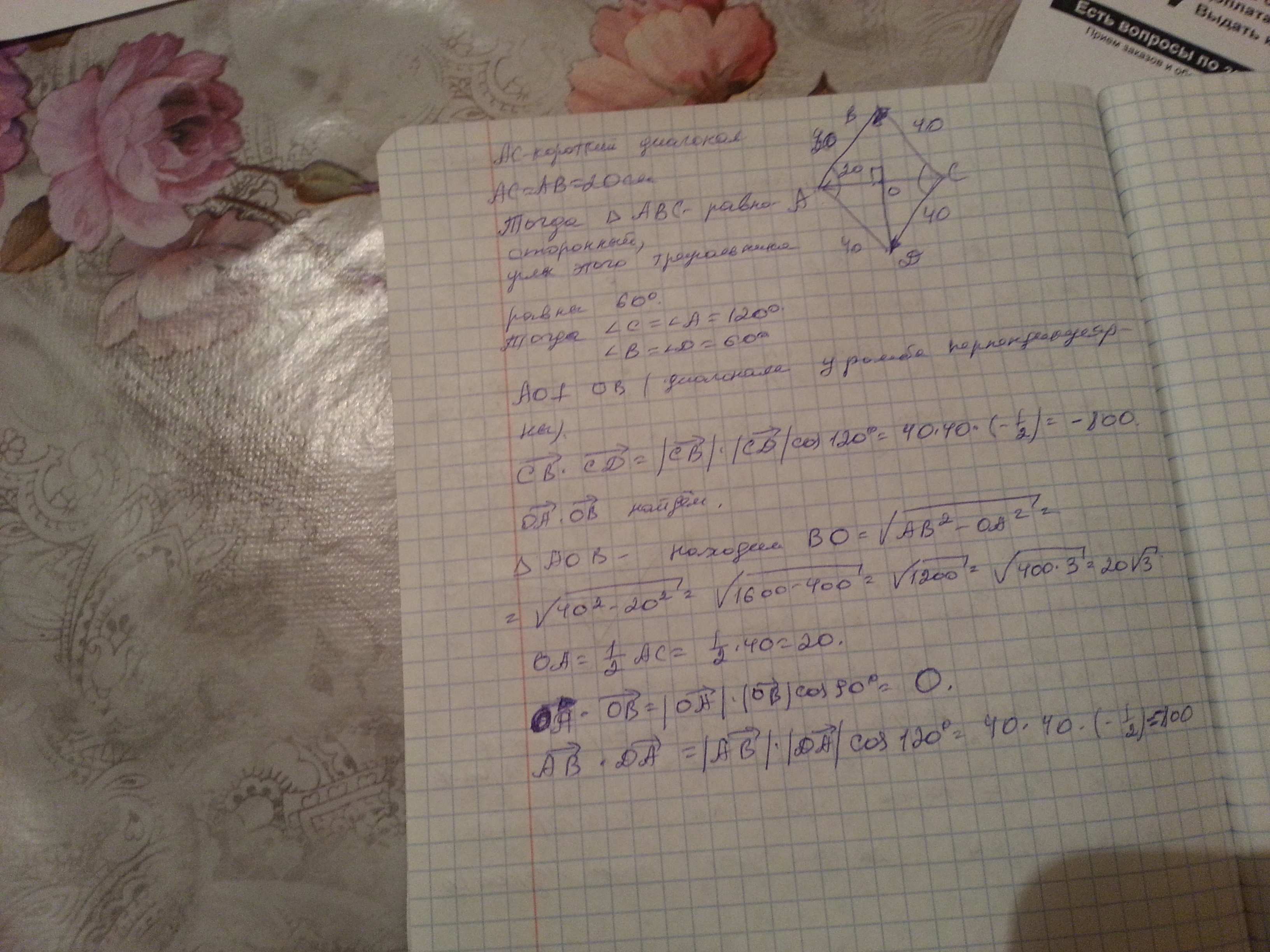Дан ромб,короткая диагональ которого равна стороне длиной 40 см. Найдите скалярное произведение векторов CB и CD; OA и OB; AB и DA
