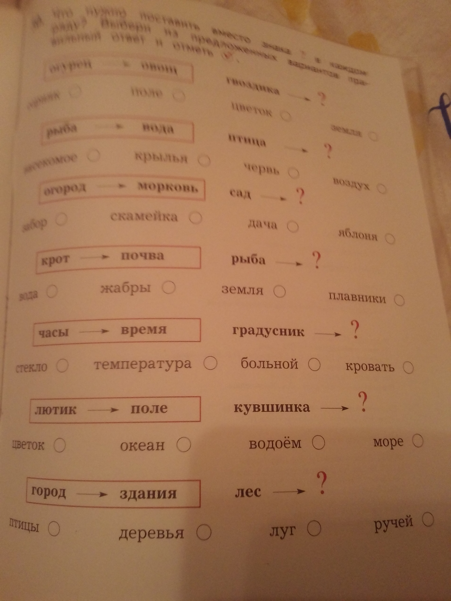 пиши что где находится например рыба вода гвоздика земля