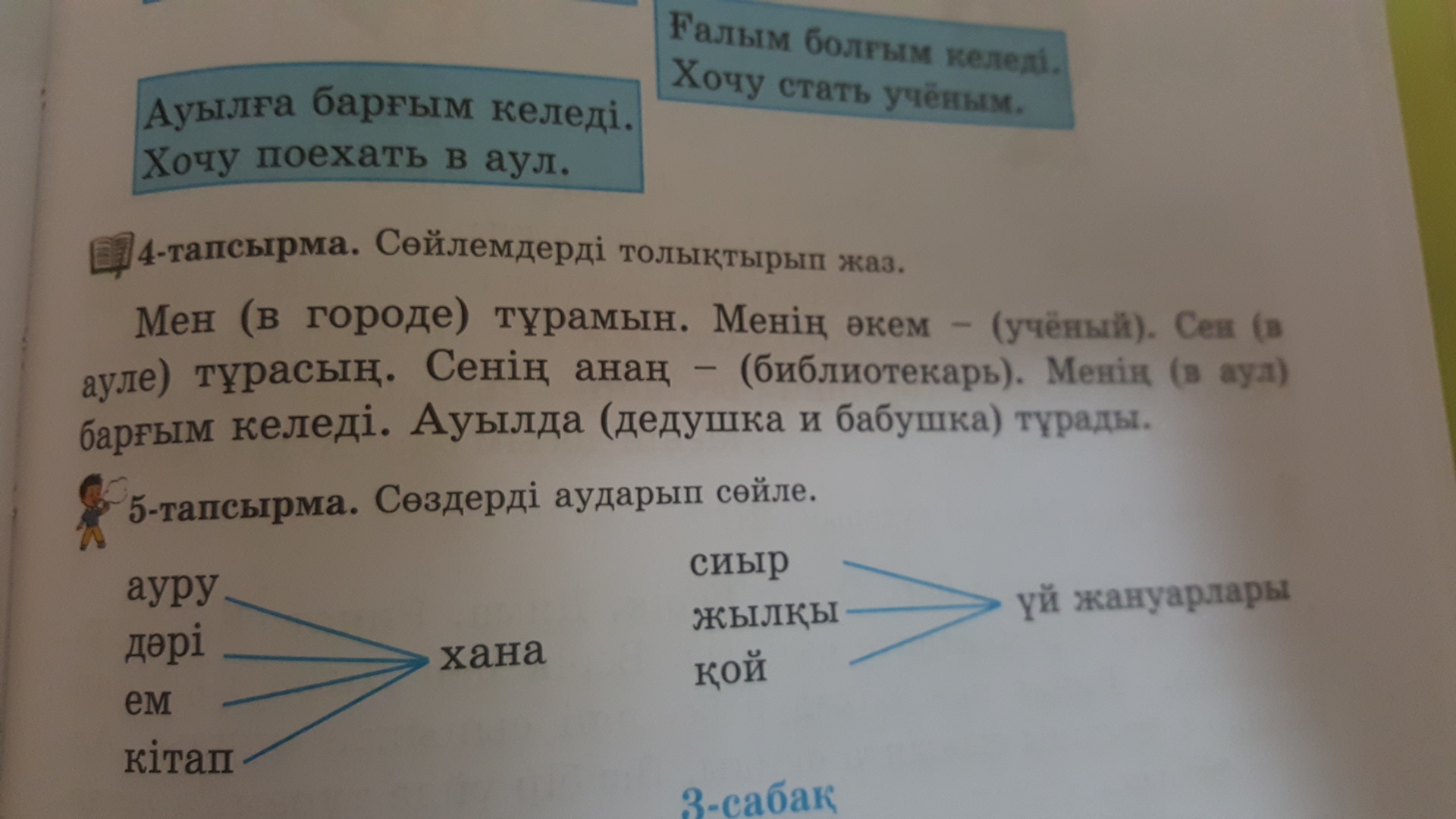 Мен калада турамын. Менын акем- галым. Сен ауылда турасын. Сенын анан- кытапханашы. Менын ауылга баргым келеды. Ауылда ата жане аже турады.