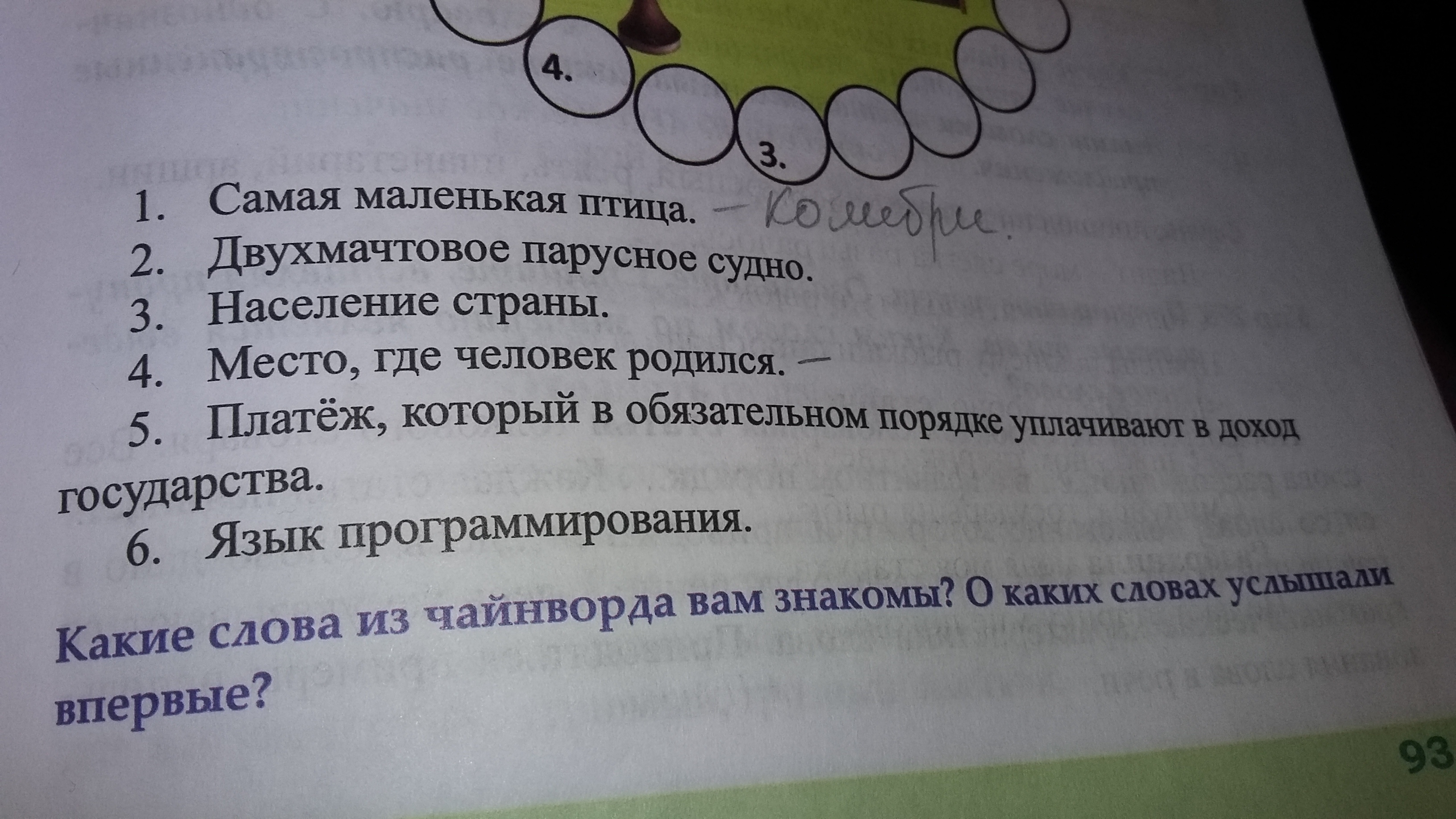 самая маленькая птица- колибри двухмачтовое парусное судно - плоскодонное транспортное судно население страны-общество место где человек родился-родина 5.налог 6.формальная знаковая система