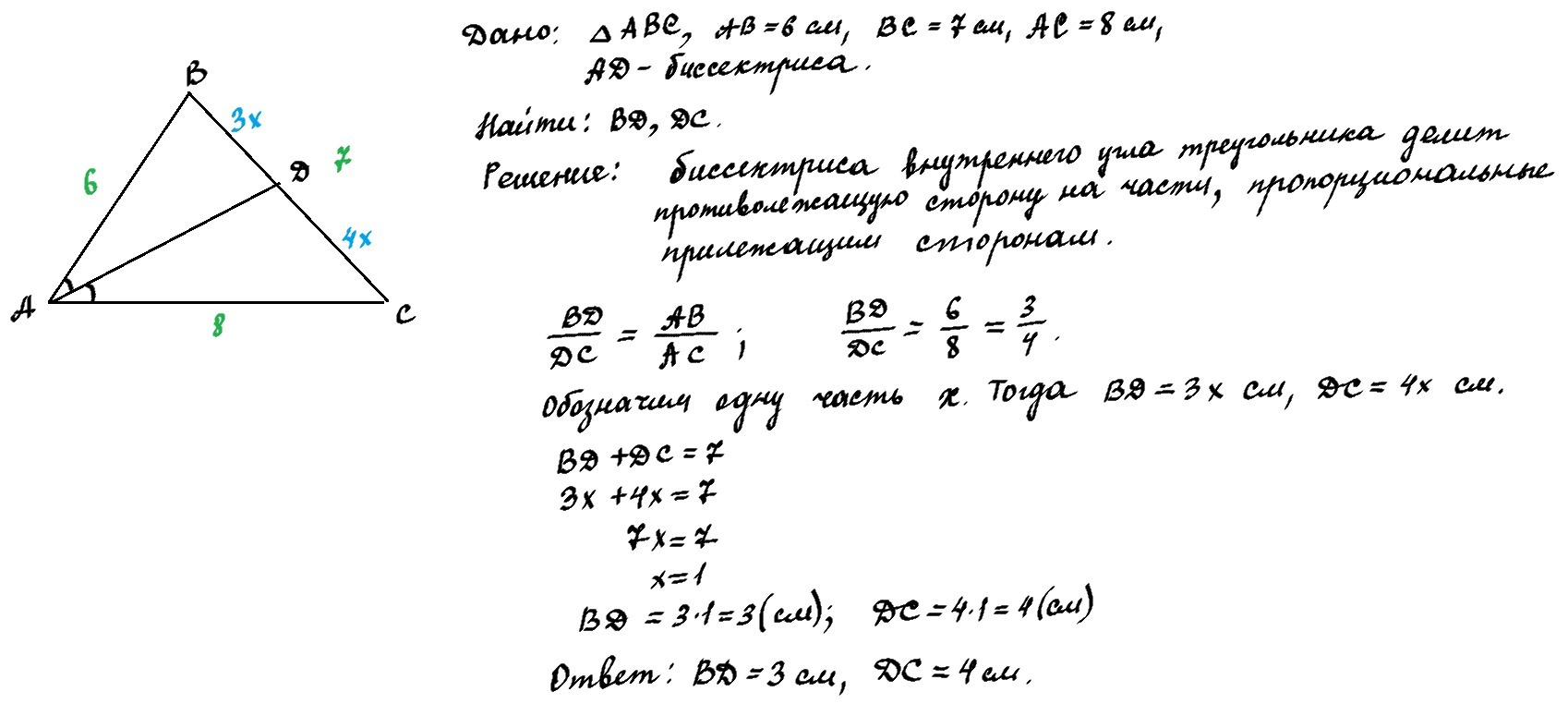Найдите отрезки, на которые биссектрисы AD треугольника ABC делит сторону BC, если AB=6см, BC=7см, AC=8см