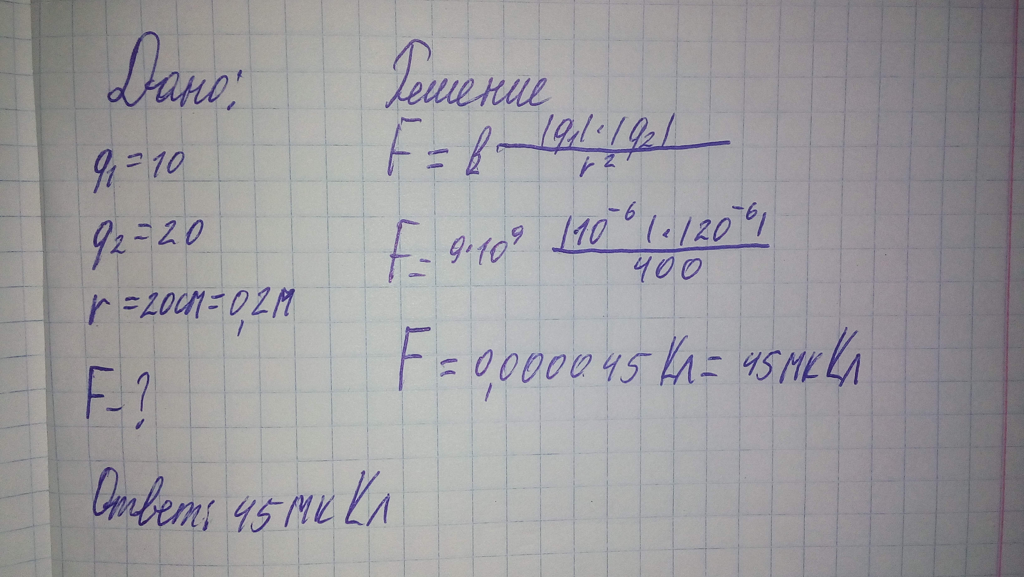 Ребят помогите))найти силу взаимодействия двух точечных зарядов,10 и 20(мк/кулон)рассположенны 20 см от 1 вакума