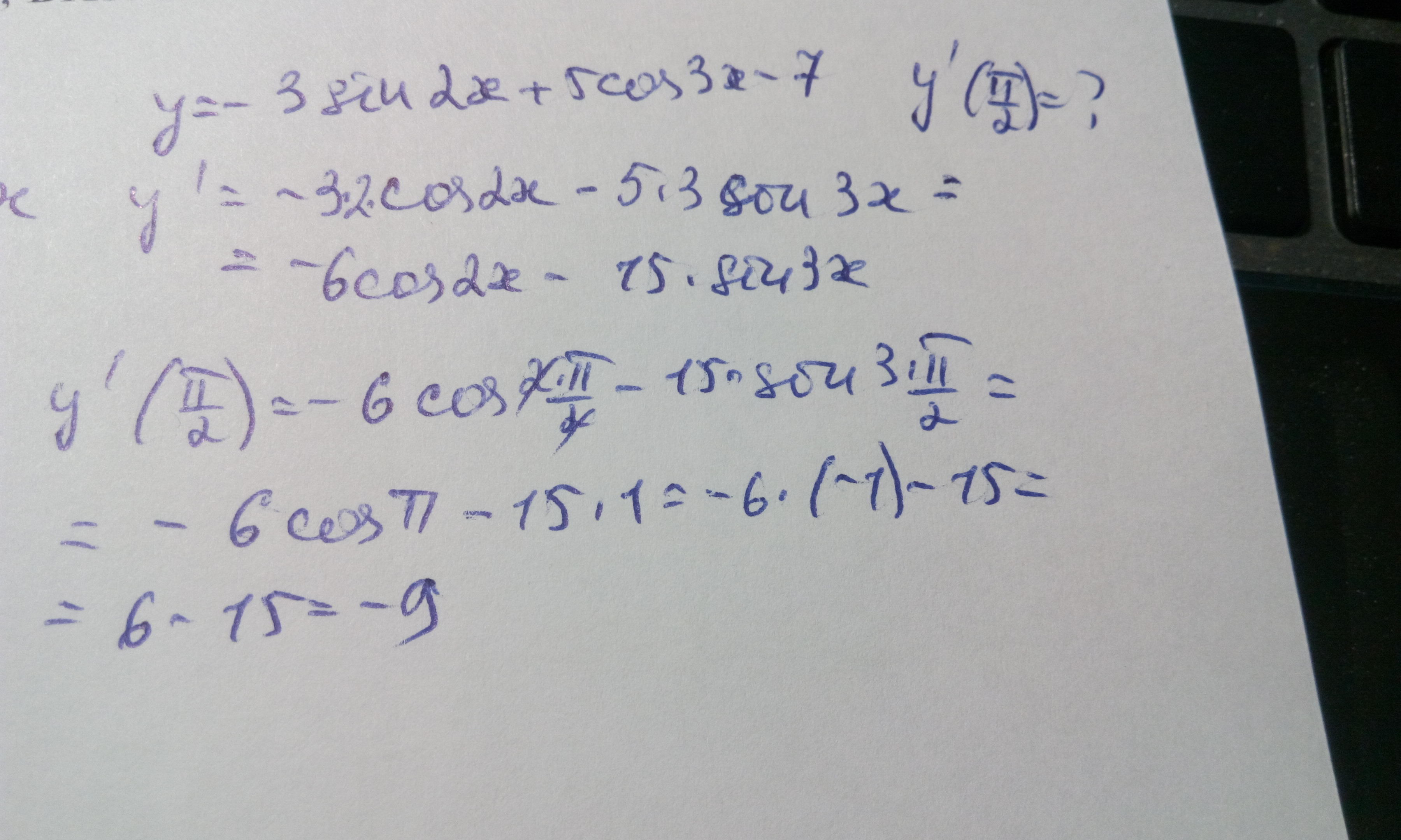 Найдите угловой коэффициент касательной к графику функции y=-3sin2x+5cos3x-7 в точке с абциссой s= П/2