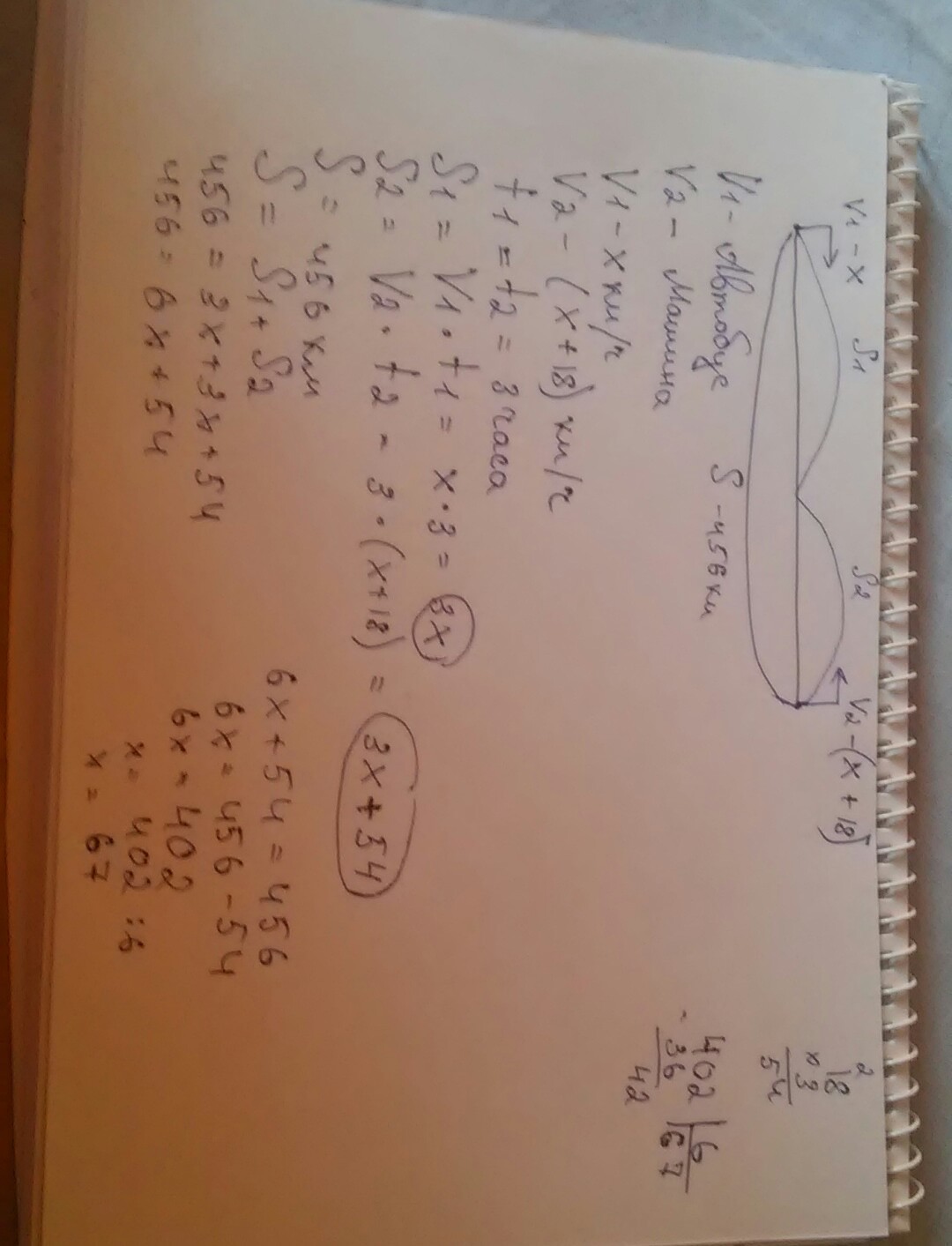 Автобус и грузовая машина, скорость которой на 18км/ч больше скорости автлбуса, выехали одновременно навстречу друг друга из двух городов, расстояние между которыми 456 км. Найди скорости автобуса и грузовой машины, если известно, что они встретились через 3ч. после выезда.